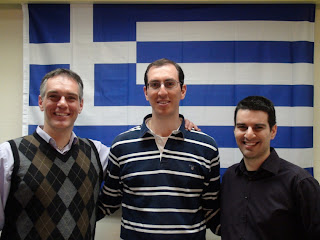 Ο Γιάννης και οι δυο Γιώργηδες, με τη γαλανόλευκη να τους υπενθυμίζει το Χρέος.